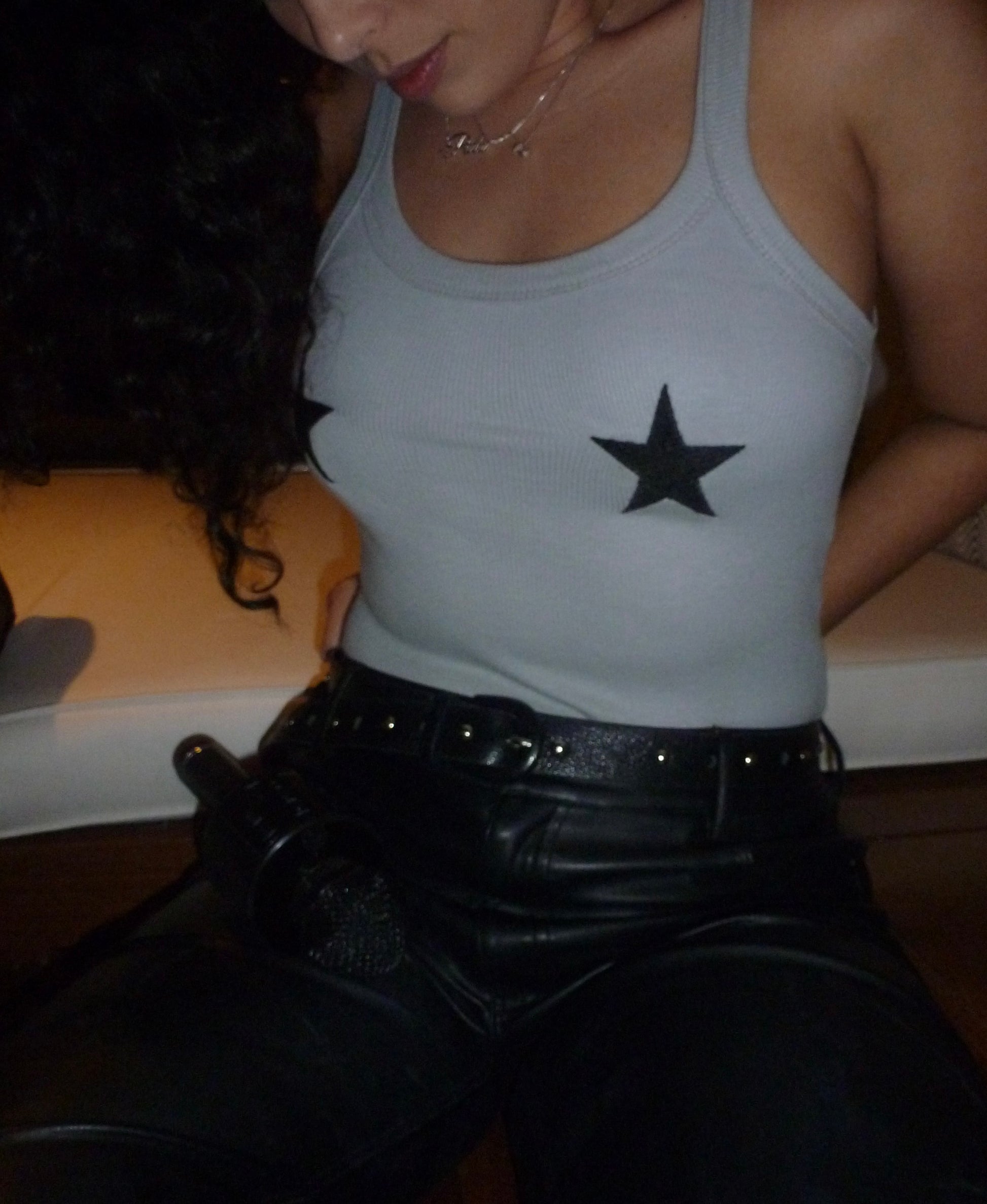 Regata em ribana de algodão e elastano com bordados de estrelas em cada lateral superior da peça.